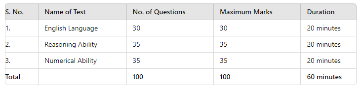 The exam consists of three sections: English Language, Reasoning Ability, and Numerical Ability.